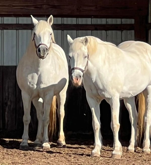 Folklore Honor Larkin (on the right) was foaled in April of 1997 by Folklore Connemara's in Missouri. Sired by Tre Twain Cavan O'Conor out of the blue eyed creme mare Balius Siobhan, she has made a significant contribution to the breed herself as a mare of 10 foals: 9 fillies, and 1 colt! She was the first mare awarded Premium status.